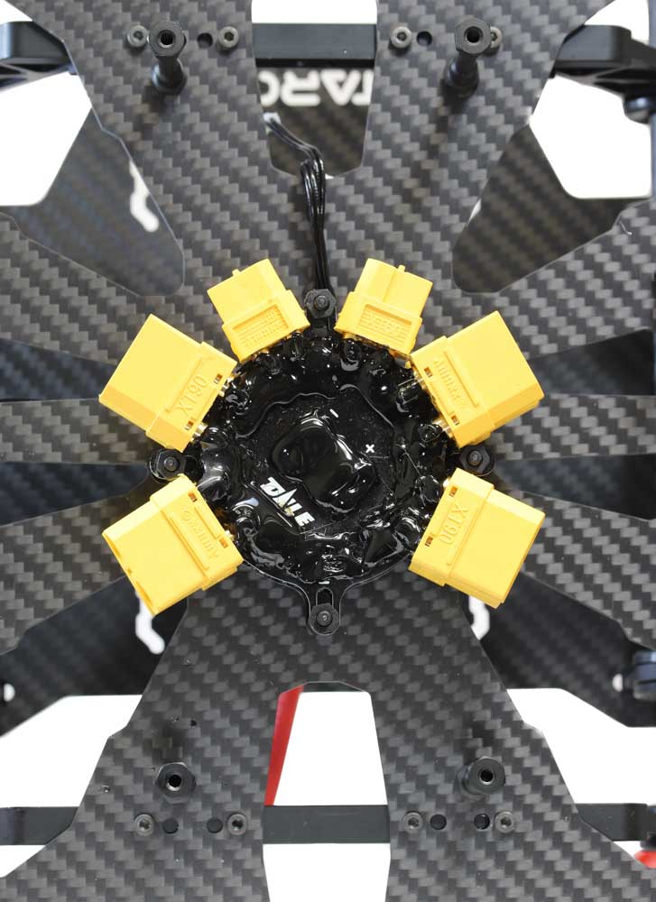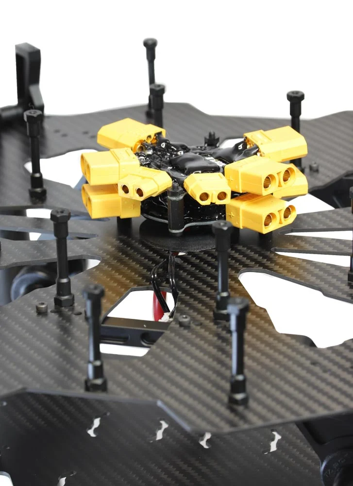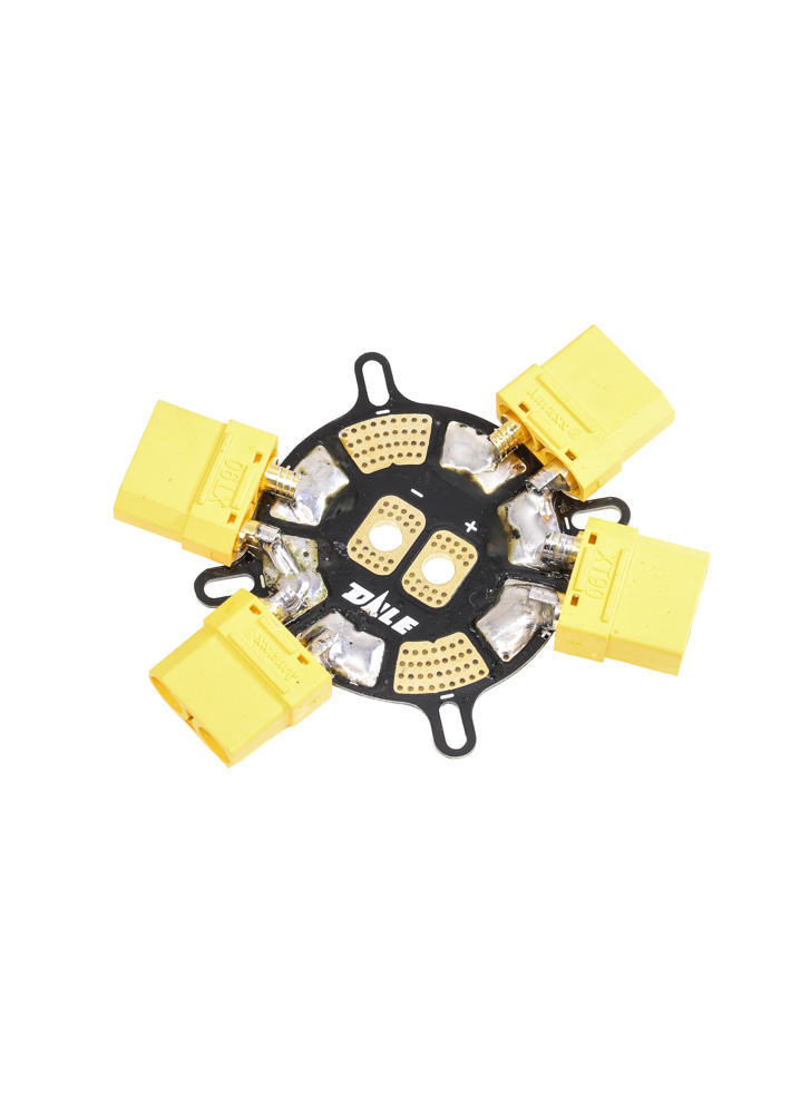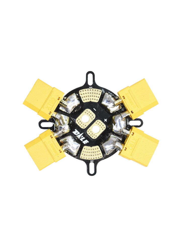 This simple Power Distribution Board (PDB) features 8 outputs (4 +/- pairs on each side of the PCB) and has a high current rating, 200Amps. The board has a well-designed layout with the power input in the centre and the outputs circling the board. If you find that you need more connections or greater current handling, you can stack two boards together (as pictured). Lastly the PDB features large contact areas which makes soldering larger cables and connectors to it straightforward. Once you have soldered the PDB, we recommend using some hot glue to insulate the contacts.