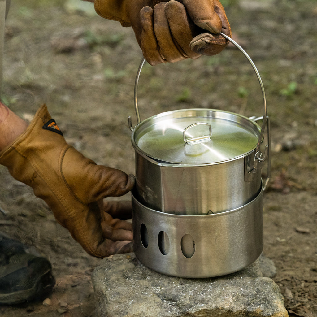 Streamline your outdoor cooking experience with our 64oz Bush Pot & Stove Stand COMBO. Made from durable 304 stainless steel, this versatile combo allows you to cook for 1-2 people, disinfect water, or melt snow for hydration. The stove stand provides stability for various cooking methods, making it a must-have for any camp chef. The Stove Stand nest with the Pathfinder 64oz Bush Pot to conveniently pack for your next outdoor trip.