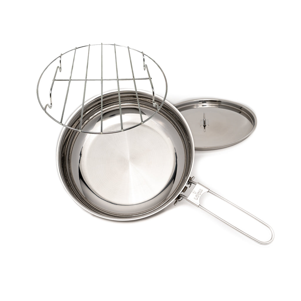 The thick skillet bottom ensures even heat distribution, and the locking/folding handle is sturdy and compact for easy storage. Perfect for the backpacker or camp chef, you can now enjoy breakfast, lunch and dinner with a single piece of cooking kit.