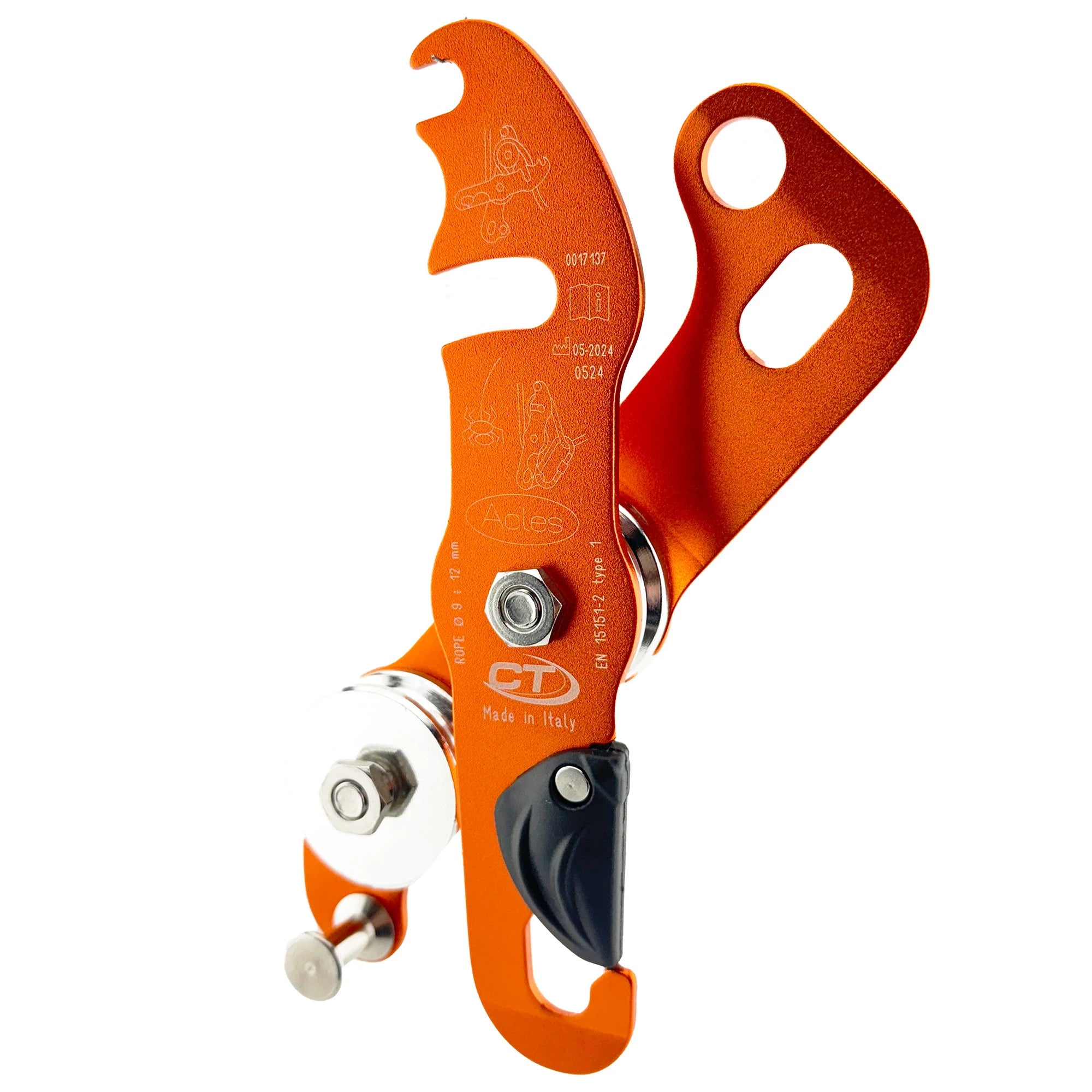 - The hole on the lower plate allows the placement of the friction carabiner directly on the device;