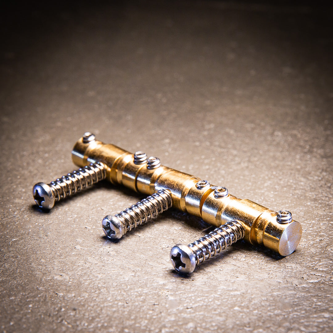 The Advanced Plating Compensated Saddles for Telecaster® are a 5/16″ diameter solid brass saddles that offer all the twang and snap you’ve come to love but with accurate intonation and reduced string noise. These saddles also feature height adjustment screws that have rounded base to allow for better contact with bridge plate and include the mounting screws and springs.