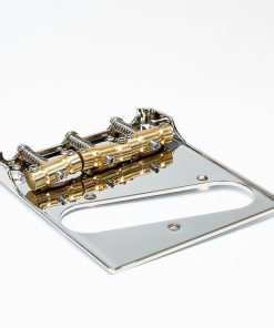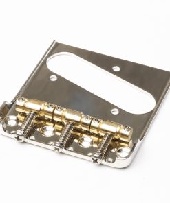 This 3-saddle Allparts bridge for Tele® features American-made compensated brass saddles by Advanced Plating and slot-end intonation screws that allow the user to adjust intonation from in front of the saddle as well as from behind the bridge. The back lip of the bridge is recessed in strategic spots to allow for use with a Bigsby or other top-mounted tailpiece vibratos.