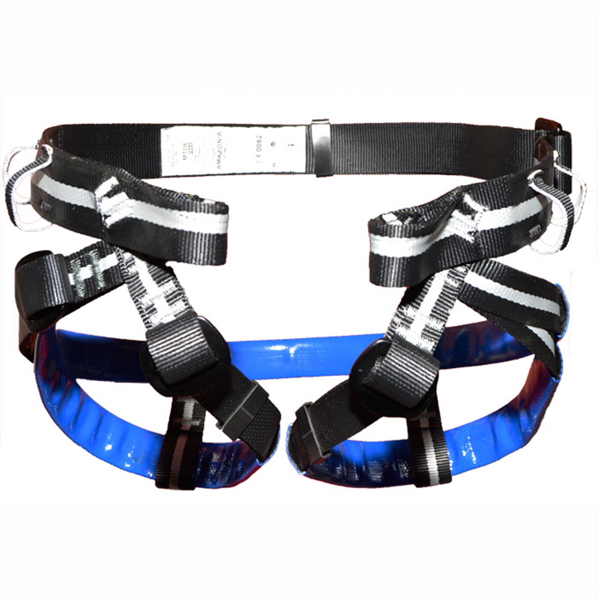 Hanging : 2 web loops. Waist belt : adjustable, support 44 mm. Thighs and buttocks : adjustable, support 26 mm. Gear loops : 4 fixed (mixed Dyneema/Polyamide flat webbing with safety seams: 2 per side). Colours : blue/grey/black. One size fits all. Maximum belt circumference : 112 cm. Weight : 645 g.