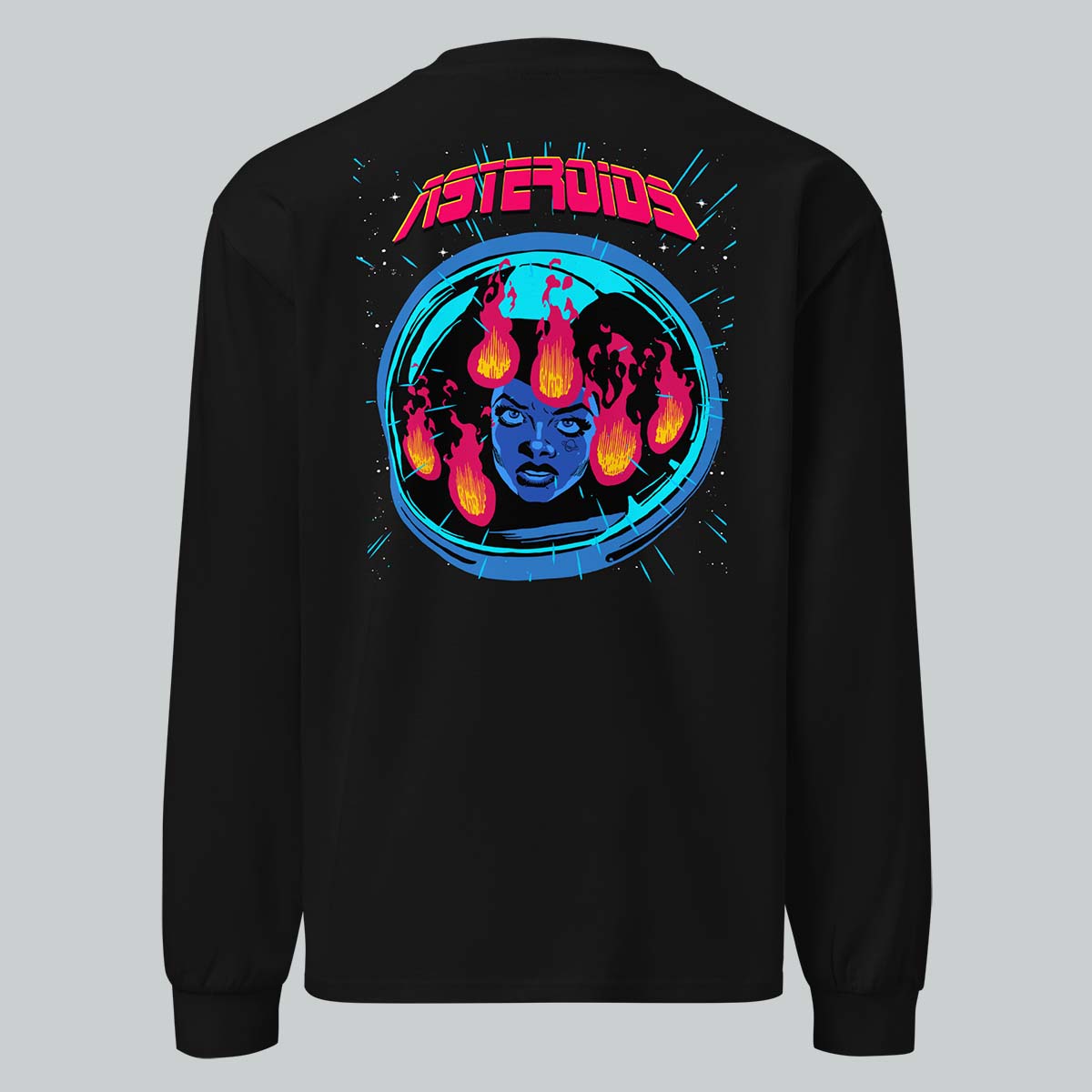 Super cool Asteroids artwork by pop-artist Butcher Billy on the back of a heavyweight long-sleeved tee.