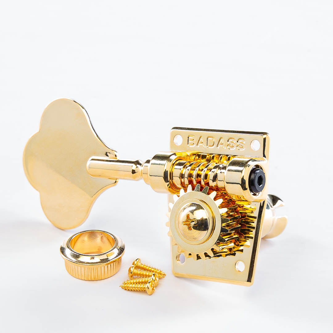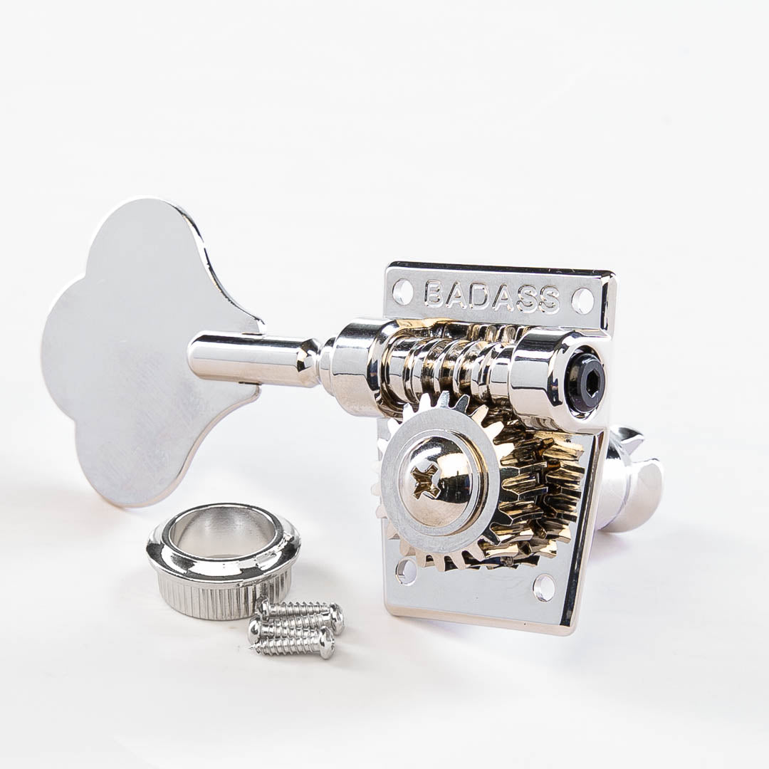 Designed as direct replacements for Squier® and Fender® basses, our Badass OGT’s offer several significant improvements over the originals without straying too far from their classic look. Utilizing a cast base plate rather than the traditional stamped-design improves stability and surface contact with the back of the headstock while a hex-head worm-gear tension screw reduces slip, ensures a smooth feel, and improves tuning accuracy. Last but not least, we lengthened the tuning key stem just a smidge for better clearance around the headstock. After all, why settle for average when you can be Badass?
