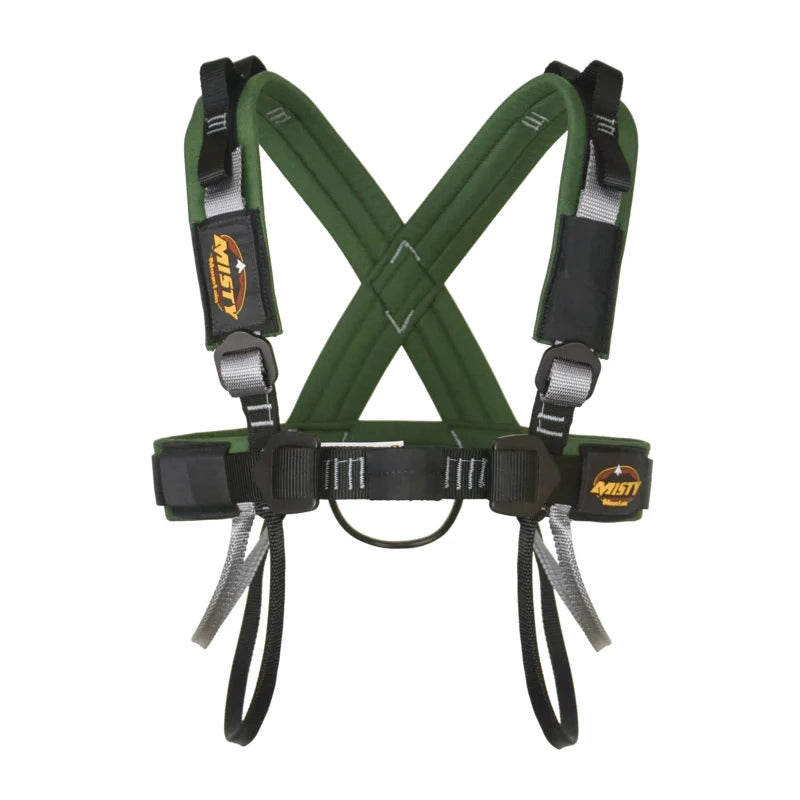 Made for carrying a full wall rack in comfort, Misty Mountain’s Big Wall Gear Sling is also a full strength chest harness designed for use in conjunction with a Titan or Cadillac Sit Harness for extra security, comfort and plenty of room for nuts, cams and slings.