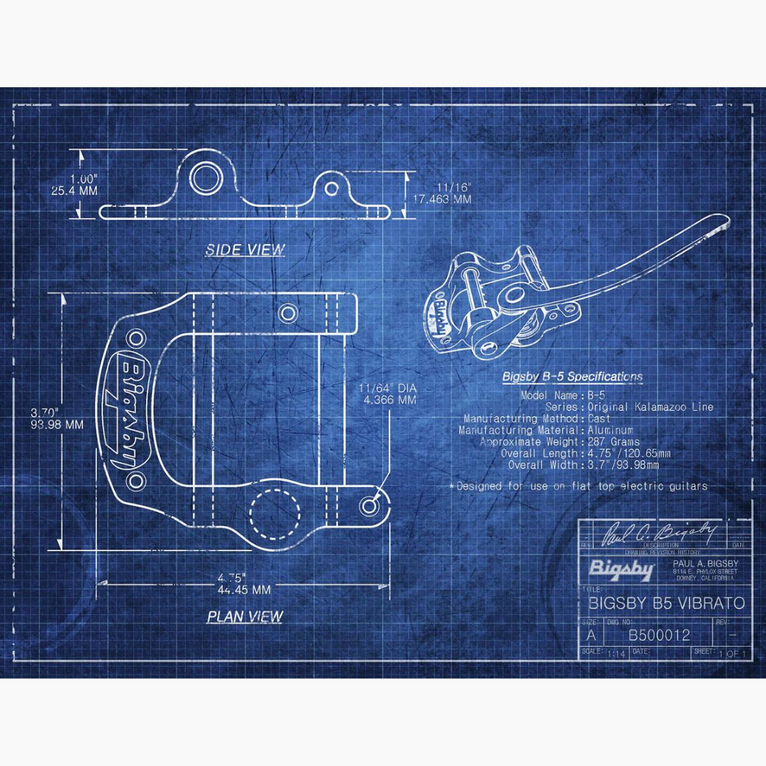 The B5, sometimes referred as the Bigsby “horseshoe” is designed for flat top solid body guitars. Attaching via four screws to a guitar’s top, the B5 is extremely versatile. B5s are common on many styles of guitars including SGs, Les Paul Jrs, Telecasters, and Rickenbacker 325s.