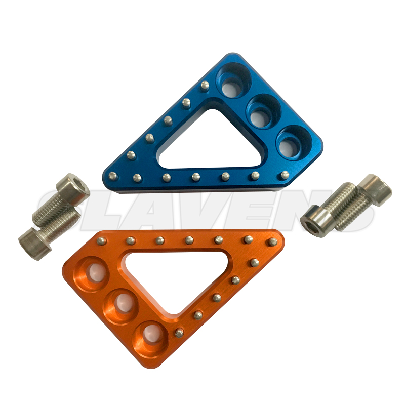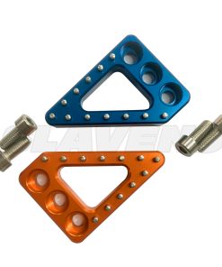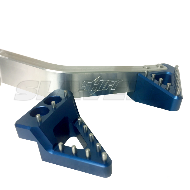 This is a slightly oversized platform from stock and mounts on the bottom side of the lever. It provides about ~ 3/8″ drop overall from stock. This is designed to work with Vanasche Motorsports Billet Brake Pedal but with a small amount of filing it will work with the stock lever.