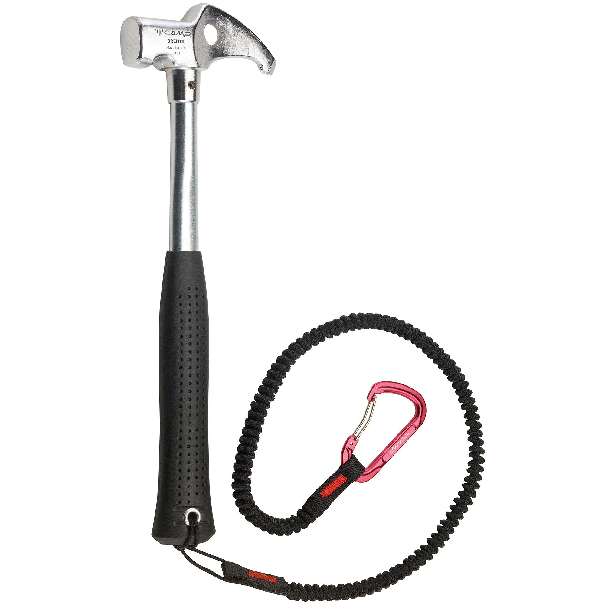 The Brenta is a compact hammer with a large face and good heft in the head for quickly driving home pitons. The pick is designed for cleaning cracks, pasting heads, and levering out pitons. The chromoly steel shaft is indestructible and the thick rubber grip dampens vibrations.