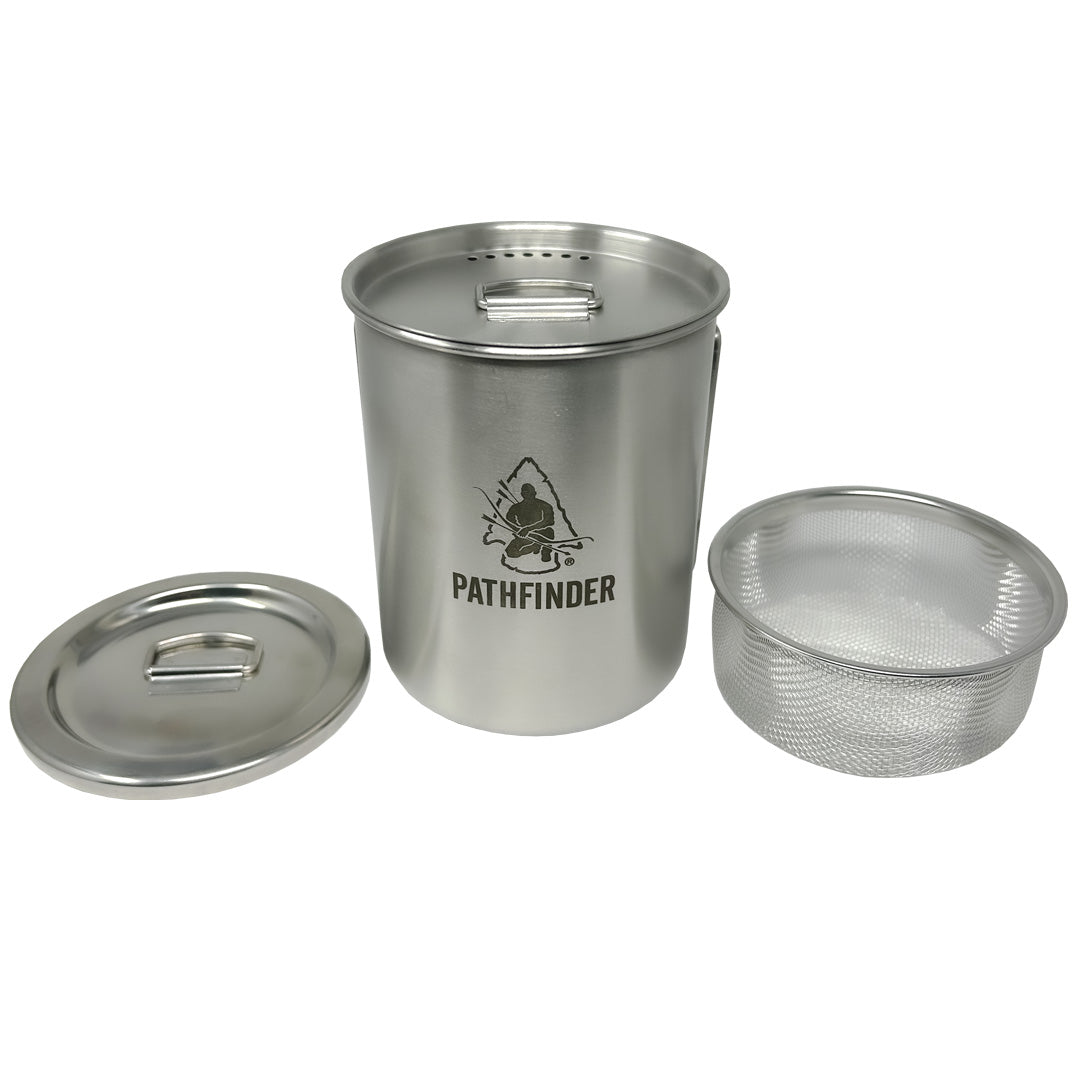 The Brew Kit Combo is truly a multipurpose piece of kit. Not only is it a cup for drinking, it’s also cookpot, measuring cup, and coffee maker, medicinal prep, or a means to gather and melt snow or disinfect water. The cup handles have a heavy gauge and large grip opening to allow for a gloved hand to easily grip the handles.