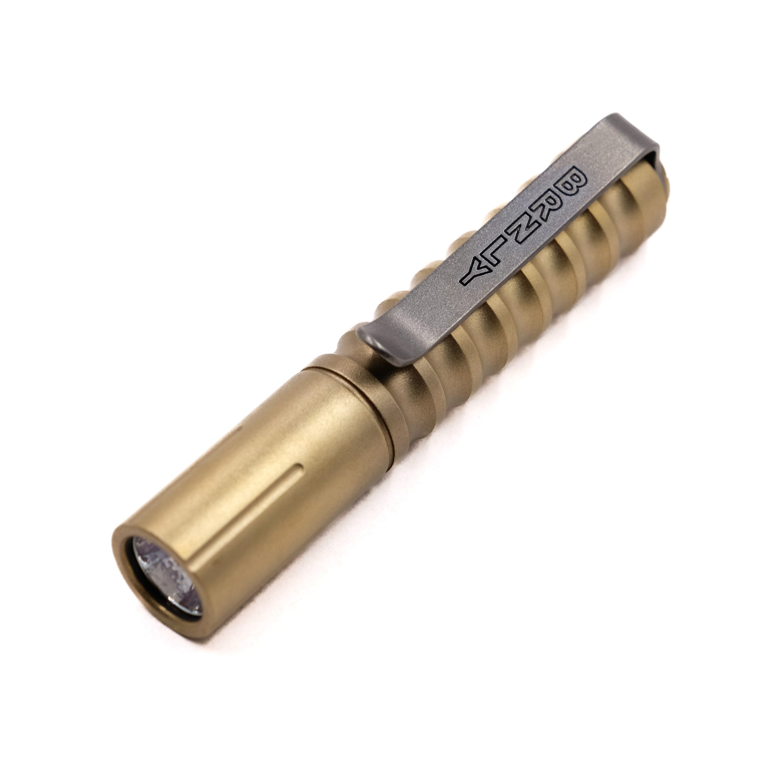 The Beta QRv2 Flashlight features a custom lasered Rose brass button and BRNLY titanium pocket clip. It features 3 modes L/M/H with output of 1/15/90 Lumens.
