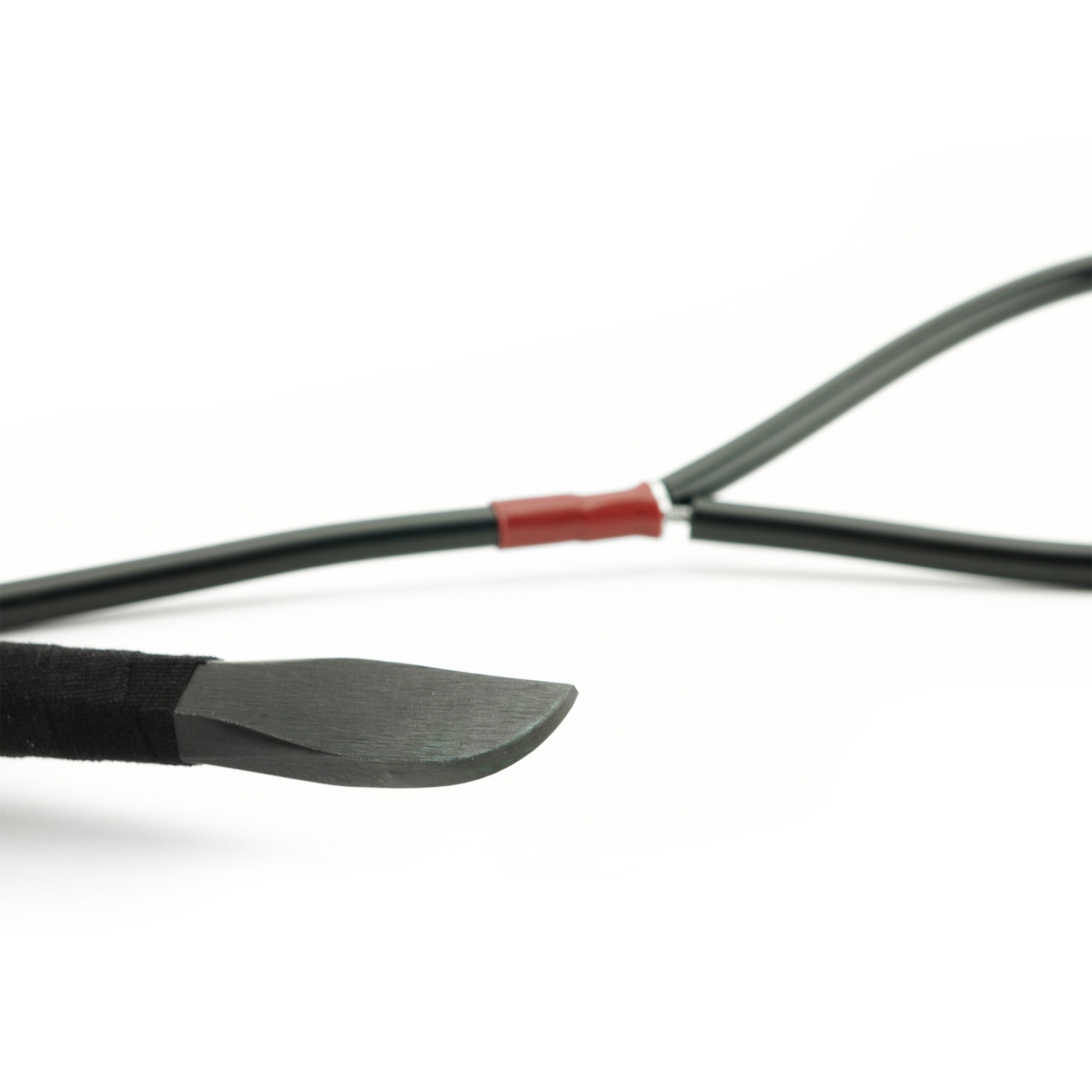 A 3/32” (#2-size) galvanized aircraft cable wrist loop is attached to the Butterknife and is looped around a smooth, lathe-cut groove. The cable is covered with 1/4” black PVC tubing and the zinc-plated copper sleeves are covered with red PVC heat-shrink, for a smooth and comfortable feel. The Butterknife is wrapped with black athletic cloth tape, for comfort and improved grip.