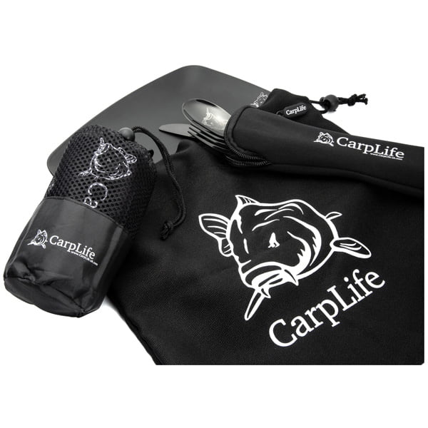 Exclusive CarpLife Matte Black Melamine Dinner Plate 24cm x 20cm, CarpLife Black Etched Stainless Steel Cutlery Set – Knife, Fork & Desert Spoon. CarpLife Micro Fibre Hand Towel 45cm x 30cm. All Supplied in a high quality weatherproof bag.