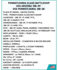 The collector’s EXECUTIVE EDITION Pennsylvania-class ships offers two options for building a historic Pennsylvania-class battleship! Thanks to the included additional bricks with markings and elements of ship features you can choose the construction of the USS Pennsylvania or USS Arizona! Clear and intuitive instructions will easily guide you through the construction process. The ship was designed in a scale of 1: 300 and is 61.5 cm long! Over 2,000 bricks will provide hours of exciting construction. The Executive version also includes a block display stand to which you can attach black plates containing the ship’s technical data and name. Thanks to the use of the latest available elements and advanced construction techniques, the model as faithfully reflects the proportions of the historic ship as possible and retains all its essential elements, including the original, very characteristic shape of the hull and superstructure. The model has numerous moving parts such as: propellers, rudders, rotating towers and gun barrels that can be raised and lowered. The set is also a perfect complement to the collection of historic COBI ships.