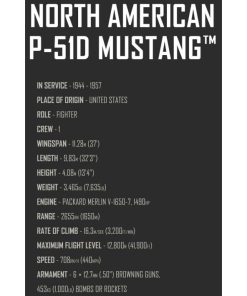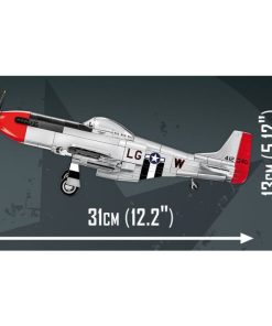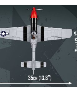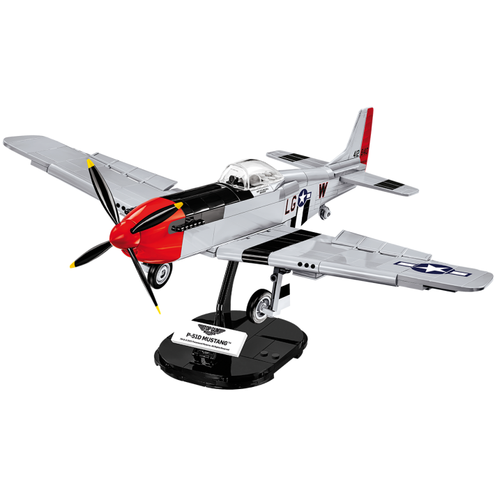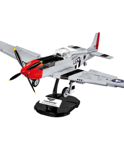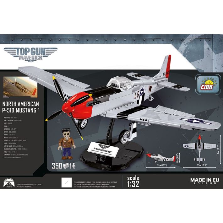 The Mustang P-51D is a building-block model from the film released under the original TOP GUN: Maverick™ license. The main character of the film, Maverick, prides himself on flying this historic aircraft. You can now build your own Mustang on a model scale of 1:32. The set has been faithfully reproduced from 350 COBI building blocks. In the set you will find high-quality prints accurately reproducing the original painting of the film aircraft. The model is equipped with rotating propellers, lockable chassis, movable wheels and an opening canopy, where you can place our special figure inspired by the main character of the film. It also includes an elegant block display stand and a plaque containing the name of the aircraft and the film logo. This exclusive licensed kit is certainly a great gift idea for builders of all ages who are movie fans, both of aviation and military movies. It looks perfect in an elegant office or in a teenager’s bedroom.