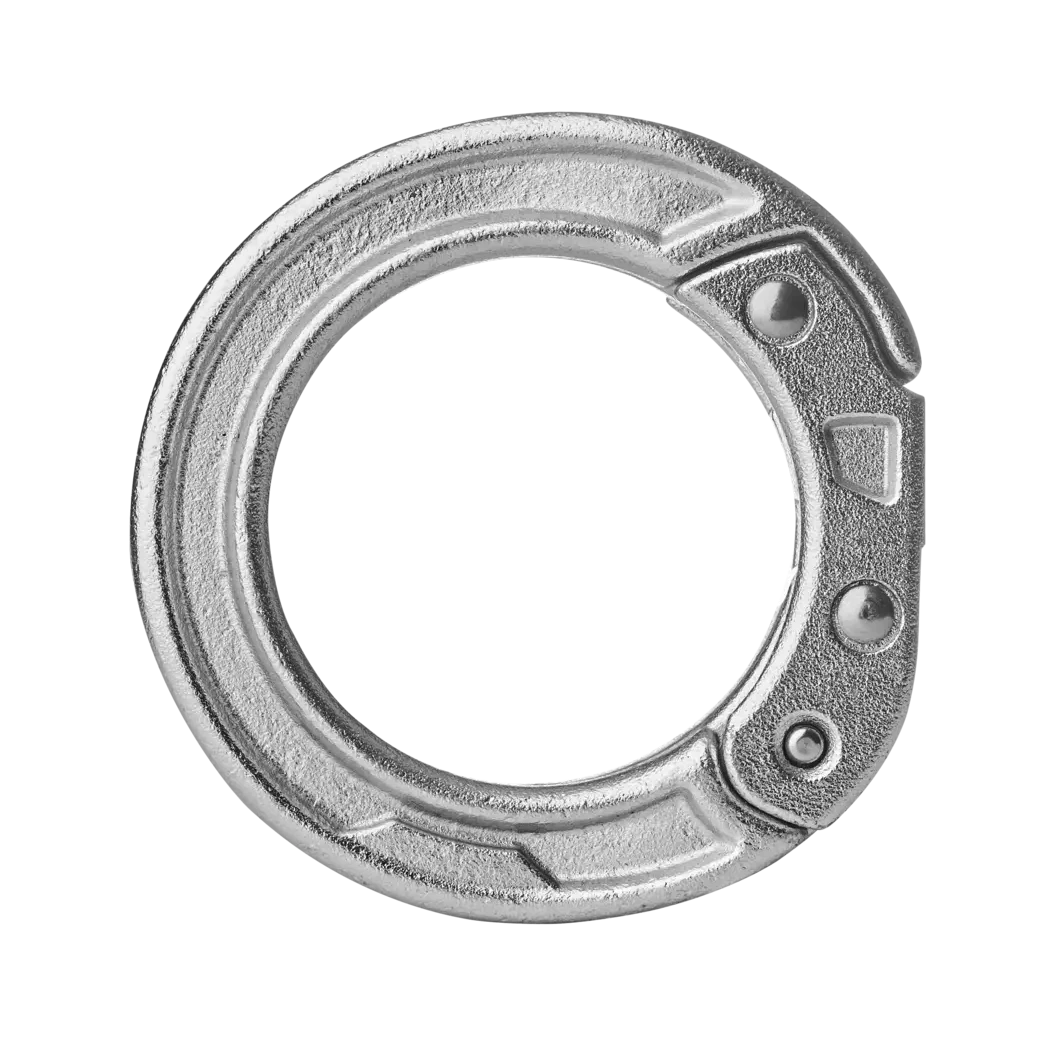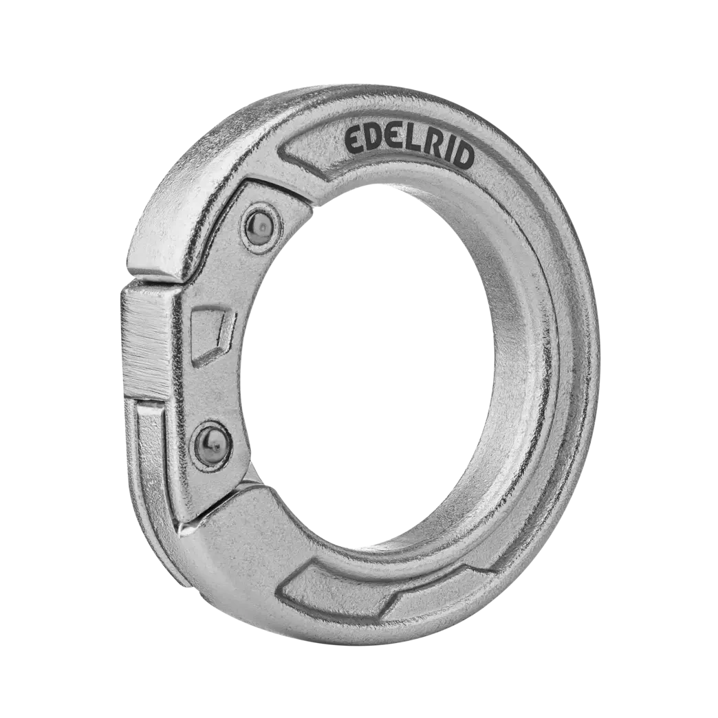 Openable steel ring in accordance with EN 362-M for permanently connecting load-bearing equipment elements in any direction. The innovative opening mechanism has been designed without a screw and is secured with a pin that can be unlocked without special tools. The opening width of 12 mm makes installing rope terminations, slings, and metal components easy.