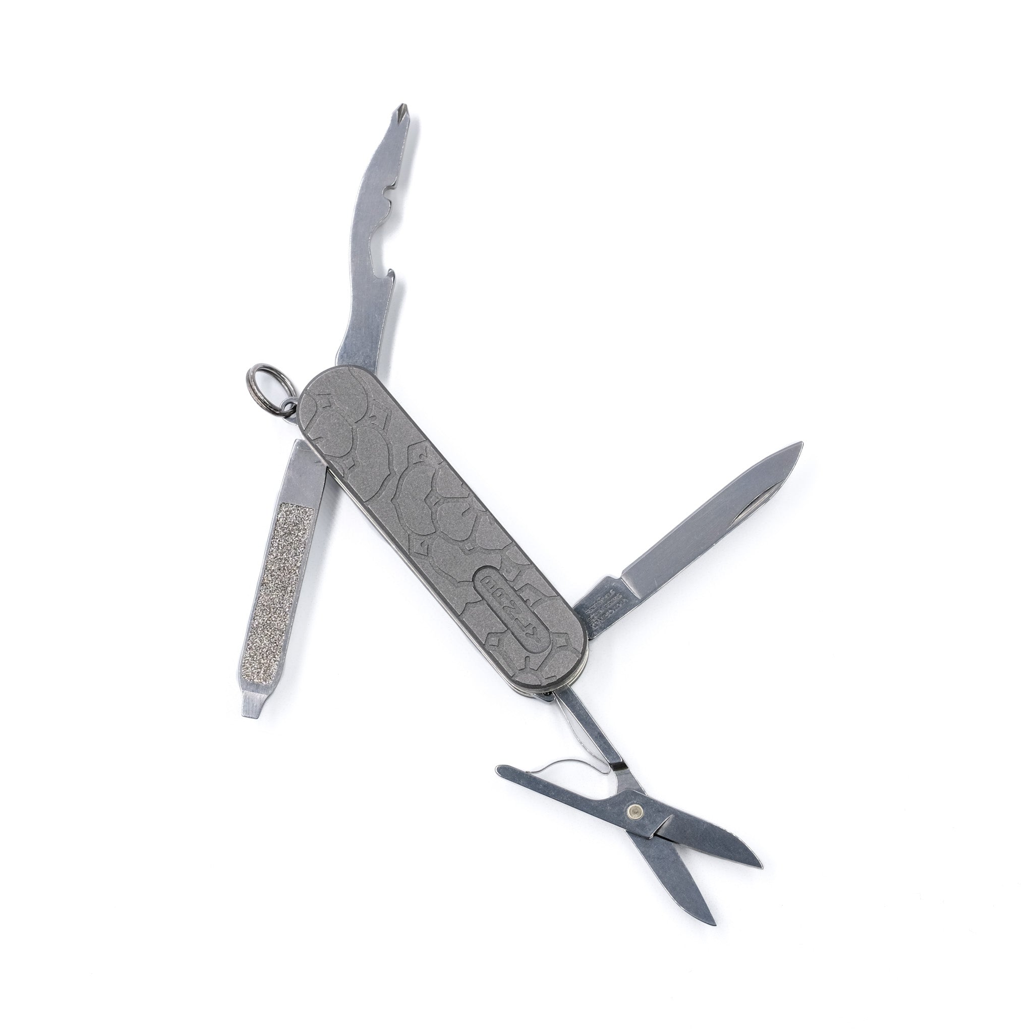 Functions of the Rambler multi-tool include: blade, bottle opener, wire stripper, magnetic Phillips screwdriver, scissors, nail file, flathead screwdriver, key ring, and bottle opener