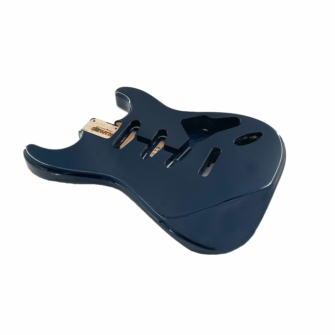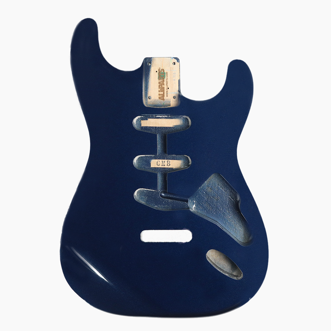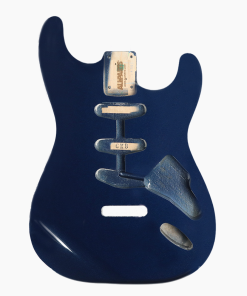 Replacement body for Stratocaster ®. Finished in Deep Metallic Blue – a deep blue with lots of metallic flake to really pop in the light. Polyurethane finish. This is a 3 piece Alder body with routing for traditional Stratocaster pickups – S-S-S.