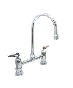 Pantry faucets with a rigid base and a 5-11/16″ wide attached Gooseneck spout. Pantry faucets with a rigid base Has a stream regulator outlet as well. 8″ centers wall mount style faucet with double levers for hot and cold water. Made of Brass with Chrome plating. The cartridges are of compression type with spring checks for a reliable, long lasting product.