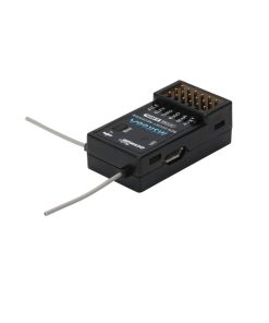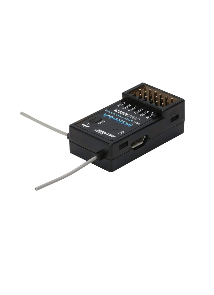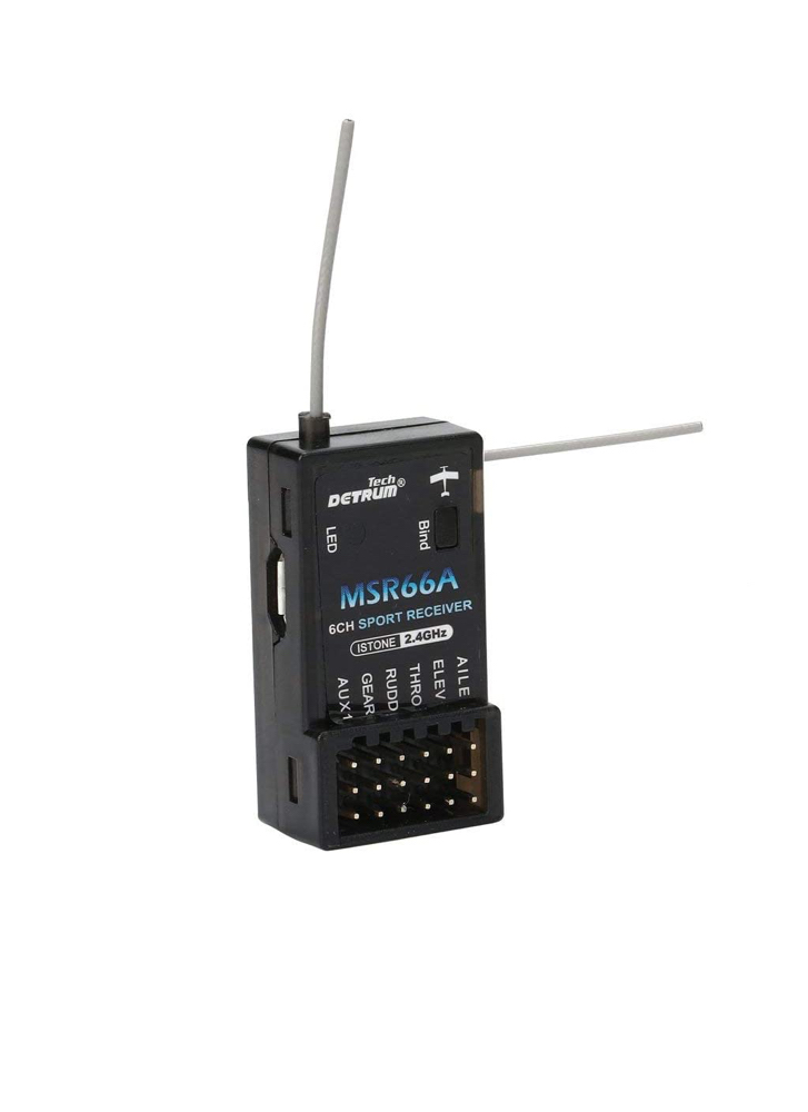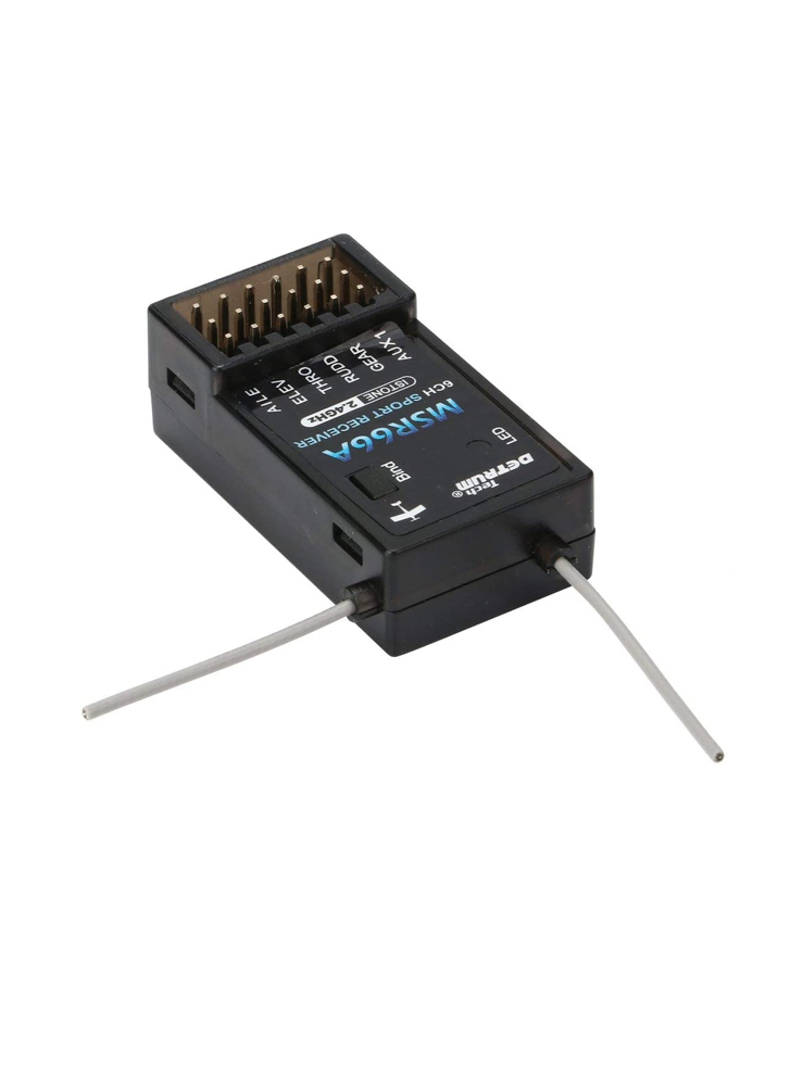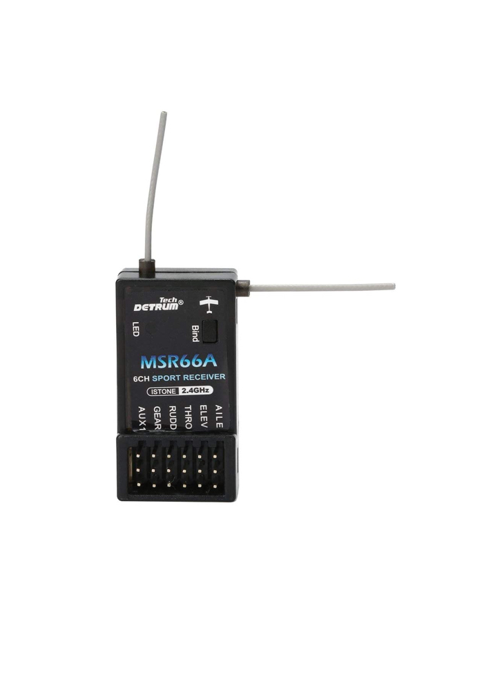 The MSR66A is a mini 6-channel 2.4GHz receiver integrated with 6-axis gyro and suitable for normal wing, fly-wing, and V-tail airplanes. It provides four different flight modes: Gyro off, Normal, Aerobatic, and Auto-Recovery (Auto Balance) and can be programmable from the matched transmitter or Detrum programmer.