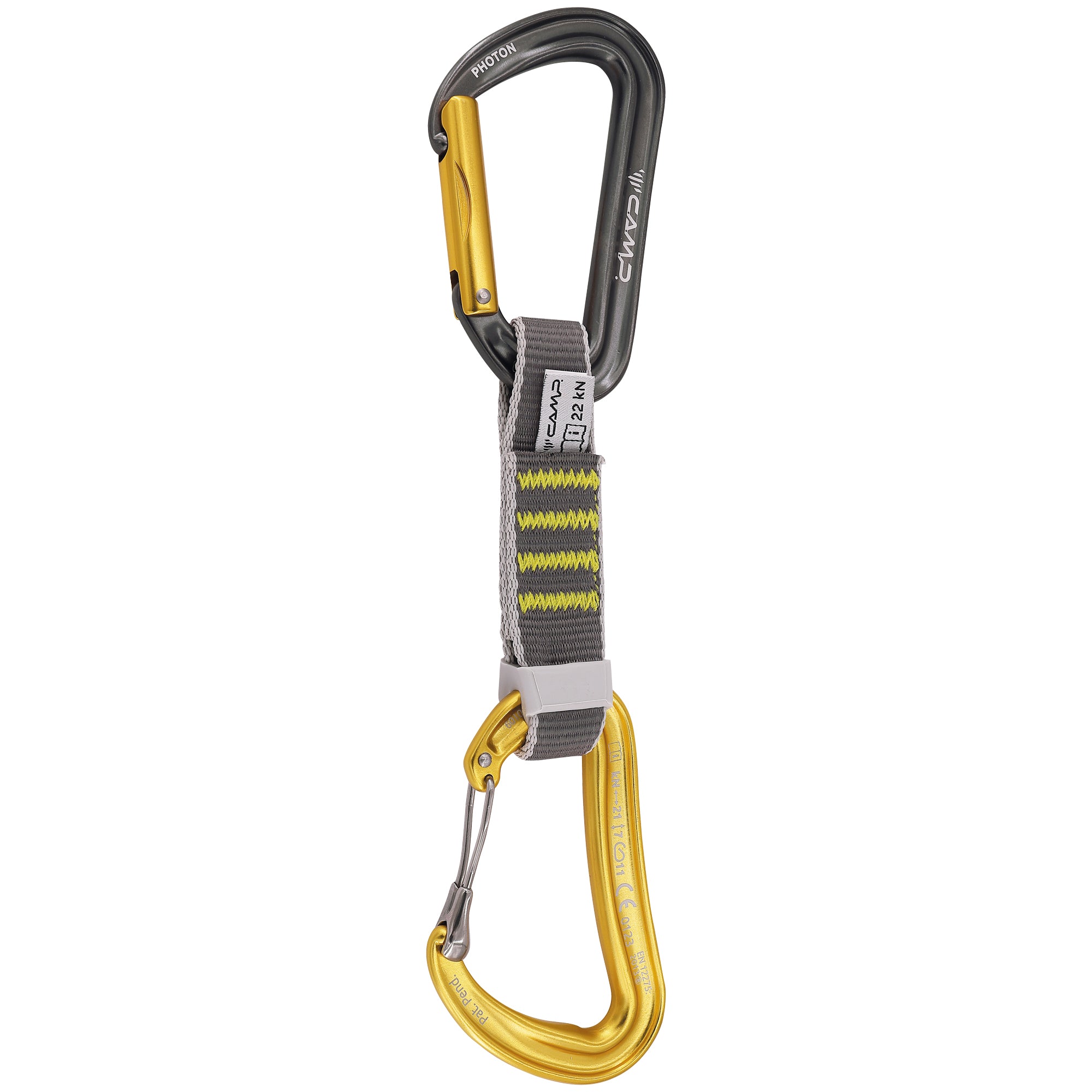 Camp’s most sophisticated quickdraw for sport climbing at the highest level. The Dyon Mixed Express KS utilizes the tried and true Photon straight gate carabiner on the bolt end and the Dyon KeyWire carabiner on the rope end. The Dyon uses a two-part gate to combine the benefits of smooth wire gate action with a keylocking closure. This unique combination gives it both high levels of performance and safety. The curved I-Beam construction on the spine keeps the weight to a minimum while providing a high level of rigidity and an incredible open gate strength of 11 kN. The SphereLock closure is an upgrade to the traditional keylock system with an even cleaner nose profile. The Dyon Mixed Express KS also uses Camp’s most sophisticated dogbone with variable width webbing that makes them easy to grab while projecting sport routes and the Karstop Evo carabiner retainer on the rope end. Available in 11, 12 and 18 cm lengths.