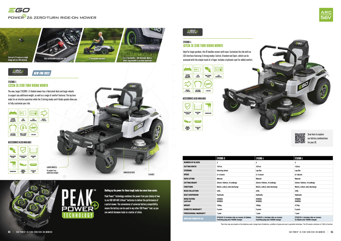 Delivering the equivalent power of a 22-horsepower petrol engine, with none of the emissions, the Z6 covers up to 2.5 acres on a single charge with six 12Ah batteries. You can tailor the combination of batteries exactly to match the size of your lawn and to how you prefer to cut your grass – unlike any other battery-powered ZTR on the market.