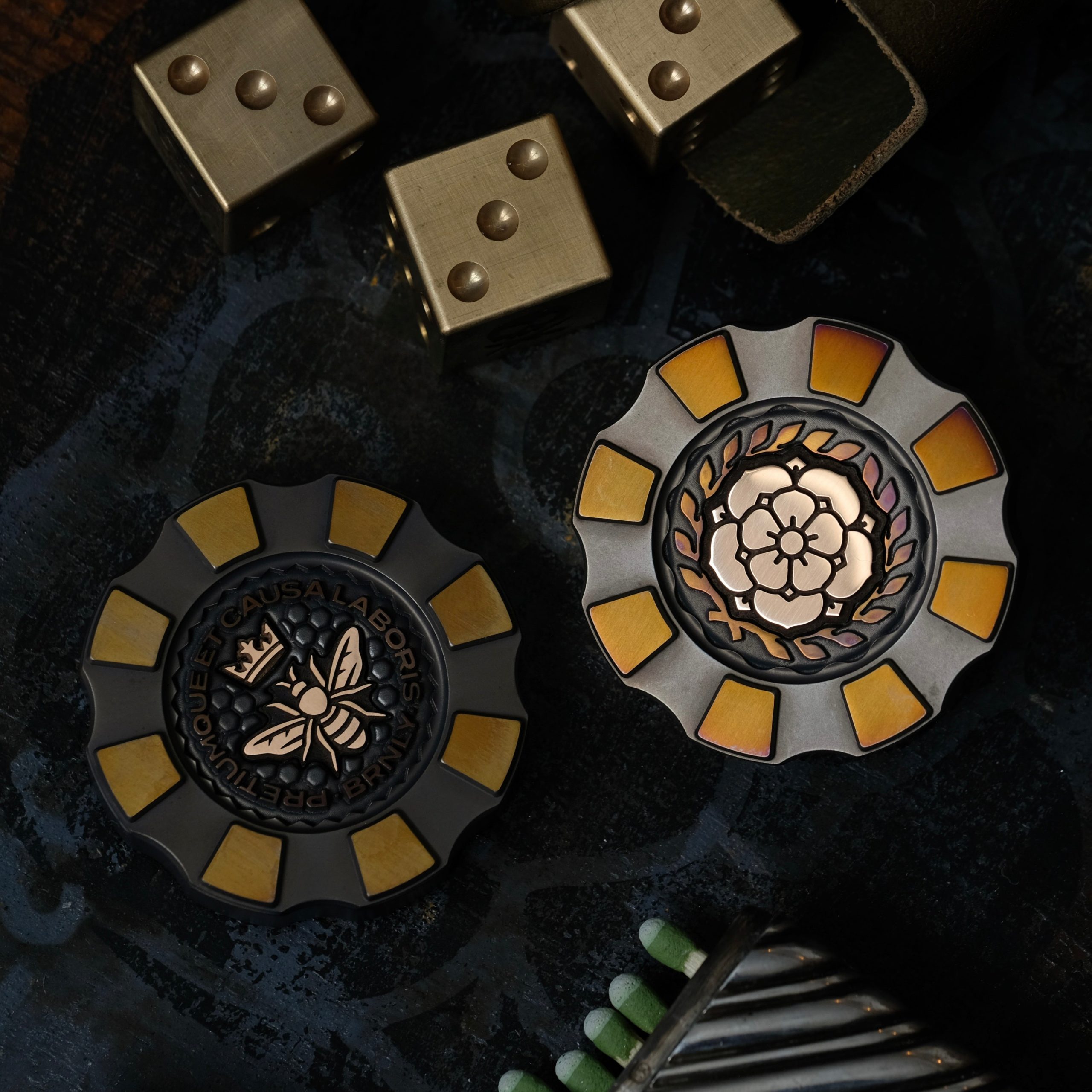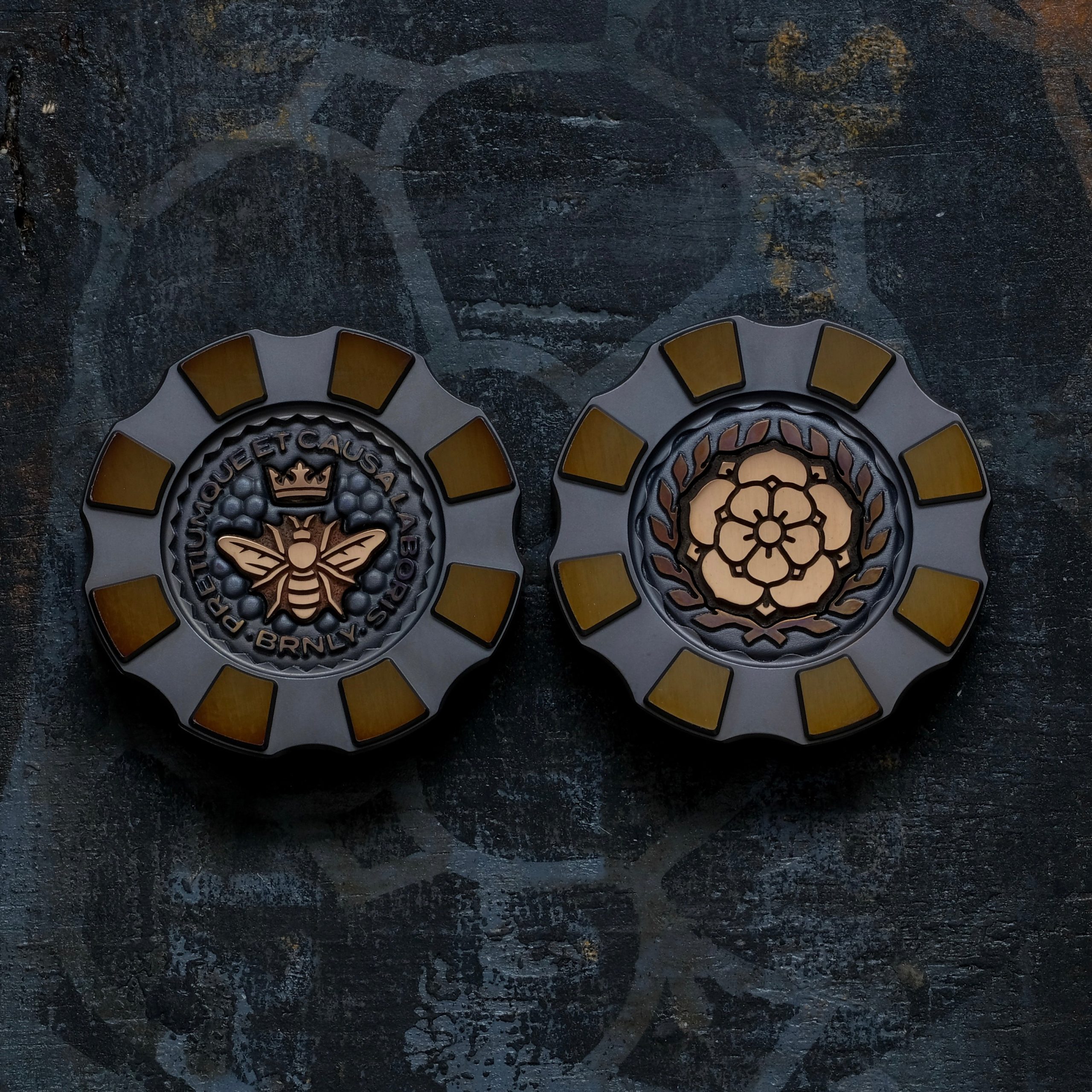 We have 12 Thick Ti Chips with Honeybee and laurel-wreathed Burnley Rose inlays.