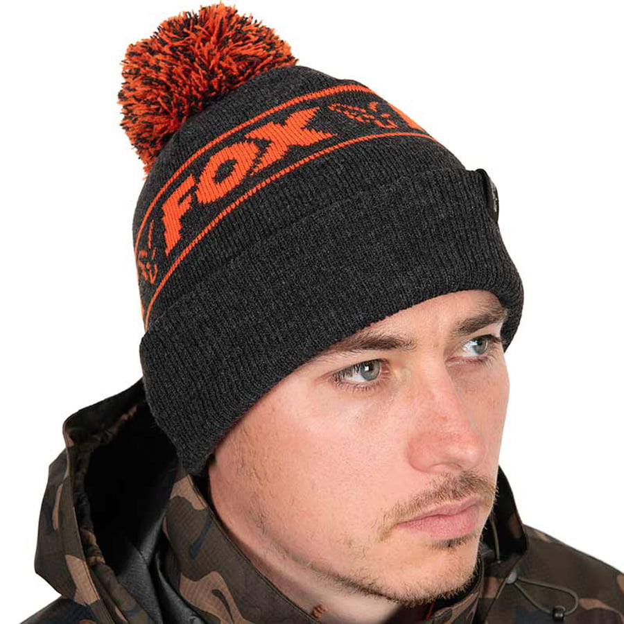 Part of the Fox Collection clothing range. Black marl bobble hat with orange Fox branding.