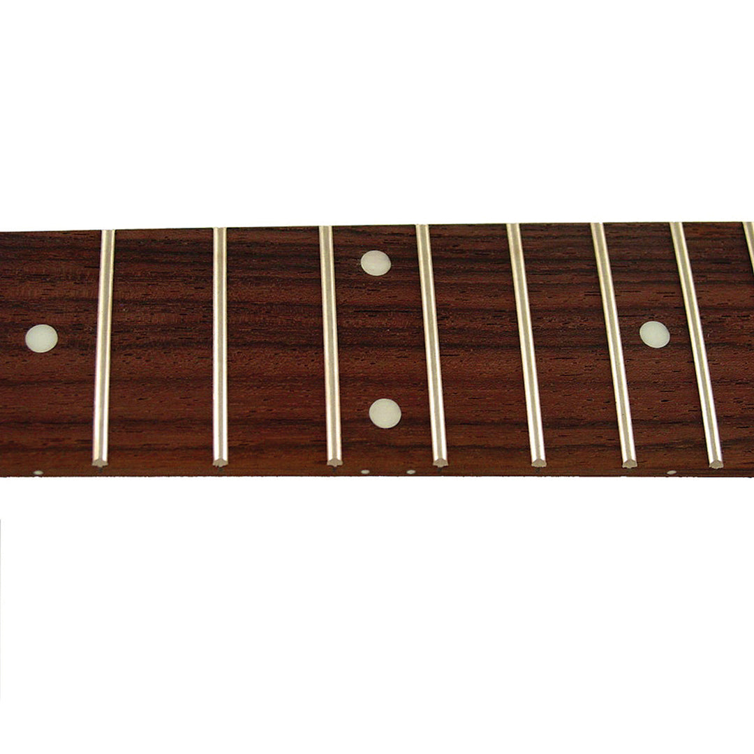 25-1/2″ Scale Rosewood fingerboard with 12″ radius, dot inlays, and 21 jumbo frets.