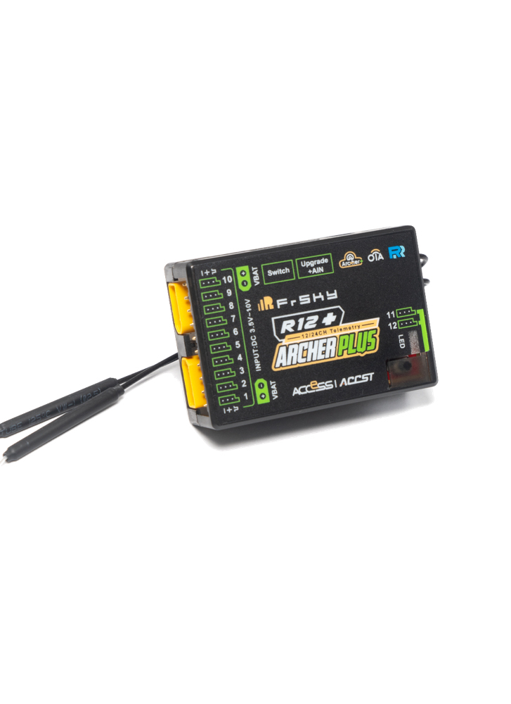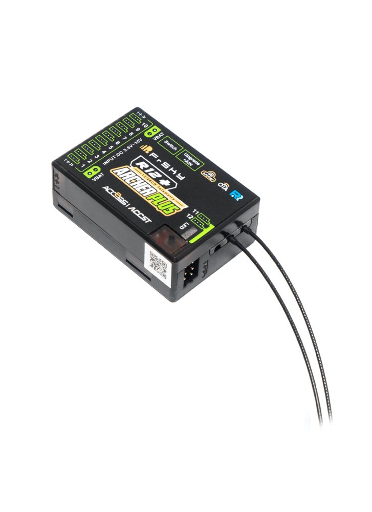 The R12+ receivers have 12 configurable channel ports*, each channel port can be assigned as PWM, SBUS, FBUS, or S.Port. The R12+ supports full-range signal strength with dual detachable antennas and guarantees optimal antenna reception and range. The R12+ can be used as a Primary receiver in a redundant solution by setting a port (Channel Port 1) as SBUS In and connecting to any other FrSky receiver equipped with an SBUS Out port. With the FBUS protocol, the Archer Plus series receivers can open up the possibility of seamlessly pairing with multiple telemetry devices (XACT servos, ADV Sensors, etc.) as well as simplifying the builds setup.