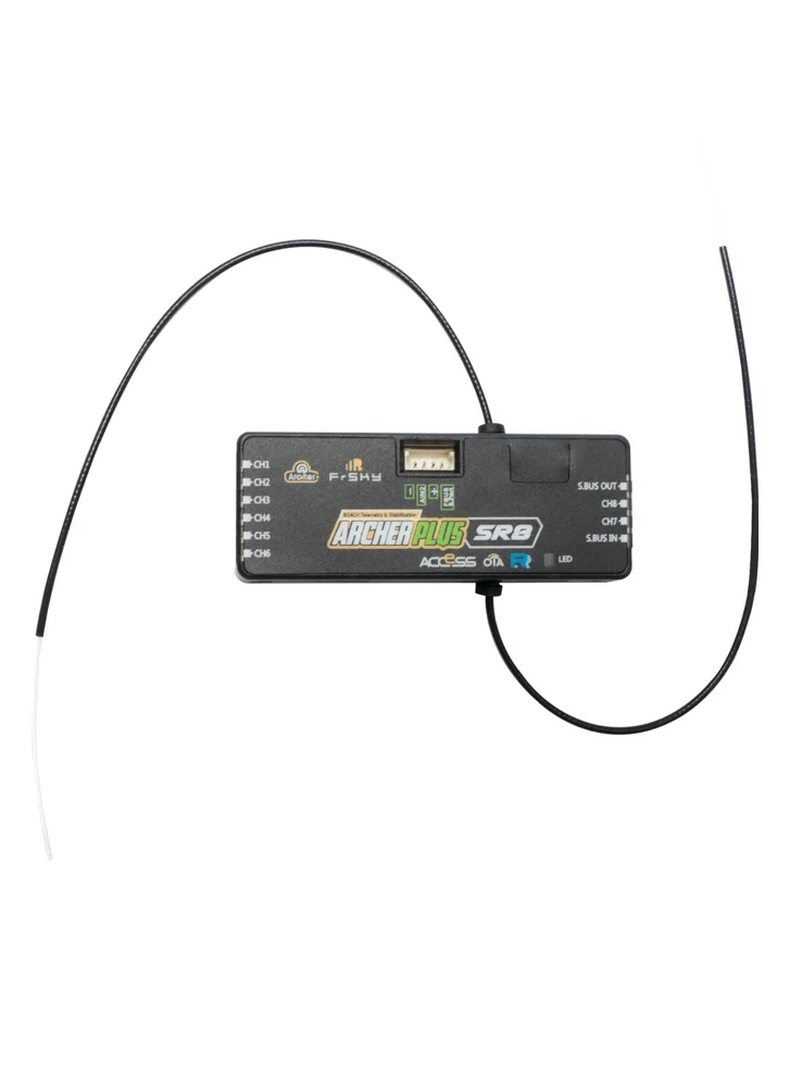 In addition, the receiver supports full-range signal strength with dual detachable antennas to assure optimal antenna reception and maximum range. The Archer Plus SR8 can also be used as a primary receiver in a redundant setup by wiring the SBUS in port and connecting to any other FrSky receiver equipped with an SBUS out port.