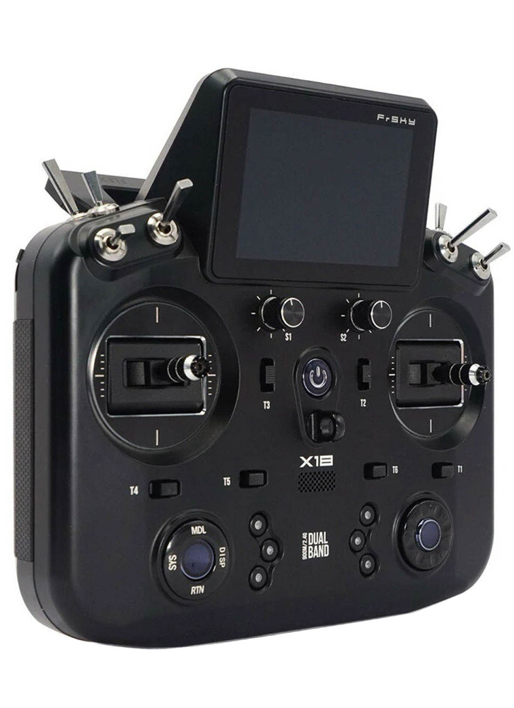 The FrSky Tandem X18 dual-band telemetry radio benefits from an enhanced ergonomic design with rounded and more comfortable hand grips, along with an improved case design to make the radio fully stable when standing. The radio includes easy-to-reach sliders and switches, 4 standard stick trims with additional 2 extra trims added to provide more flexibility with flight attitude adjustments while operating the radio. The X18 includes further enhancements with integrated flash storage which improves and simplifies storage operation and use, and the interior of the radio has been designed with space and weight in mind, while still keeping all ETHOS setting and control features for the pilot to enjoy.