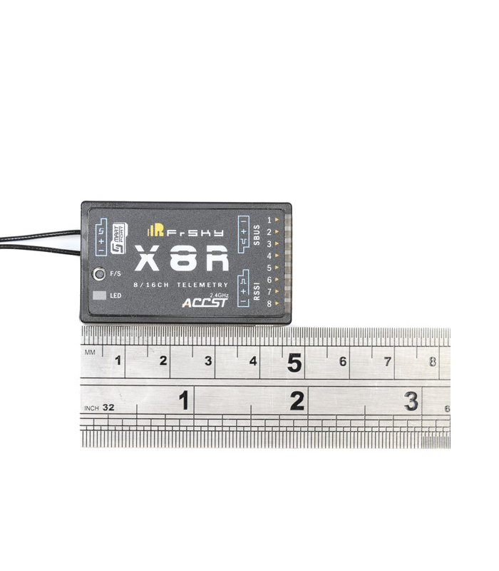 The X8R supports 8 standard servo outputs, with a further 8 being available by using the S.Bus line with S.Bus supported servos or use a FrSky S.Bus Decoder, giving you a total of 16 channels. Alternatively, you can use two X8R receivers in combination and the channels will sync 1-8 on the first and 9-16 on the second. The second option will give a fantastic degree of redundancy, essential when flying large models and highly desirable in any event.