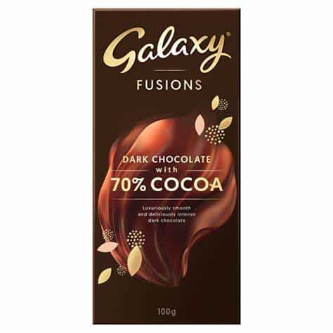 - COCOA MASS, SUGAR, COCOA BUTTER, EMULSIFIER (SOYA LECITHIN), NATURAL VANILLA FLAVOURING. (MAY CONTAIN: BARLEY, WHEAT, MILK).COCOA SOLIDS MINIMUM: 70%