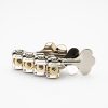 The ClipHaus concept goes back to tuning machines from the 60s. The rear housing, visually reminiscent of the roof of a house, is a clip made of spring steel which presses the worm shaft against the gearwheel, resulting in a completely backlash-free movement. The housing, including the steel clip, is stamped from a steel sheet with extreme precision and reduces the weight of a set of ClipHaus tuners by about 100g compared to tuners with cast housings. In addition, these tuners employ Göldo’s ingenious patented “push-through” technology where the string is inserted through the shaft from the top of the tuner and can then be clipped off at the back of the tuner housing.