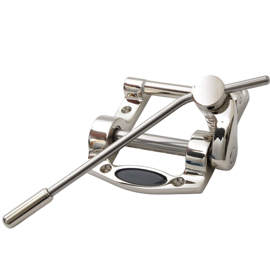 Inspired by the Duesenberg Diamond Deluxe Tremola, The Göldo G5 tremolo (MFG# TGD5) offers an aluminum frame for excellent tonal transfer and high-quality bearings that allow for smooth tremolo action and ensure tuning stability. The G5 is meant for top mount applications on guitars with a flat top like SGs and Telecasters®. The 360° rotatable round arm can be adjusted in length, response, position and movement and string changes are made easy due to string holes drilled into the bottom portion of the axel. Simply the best!