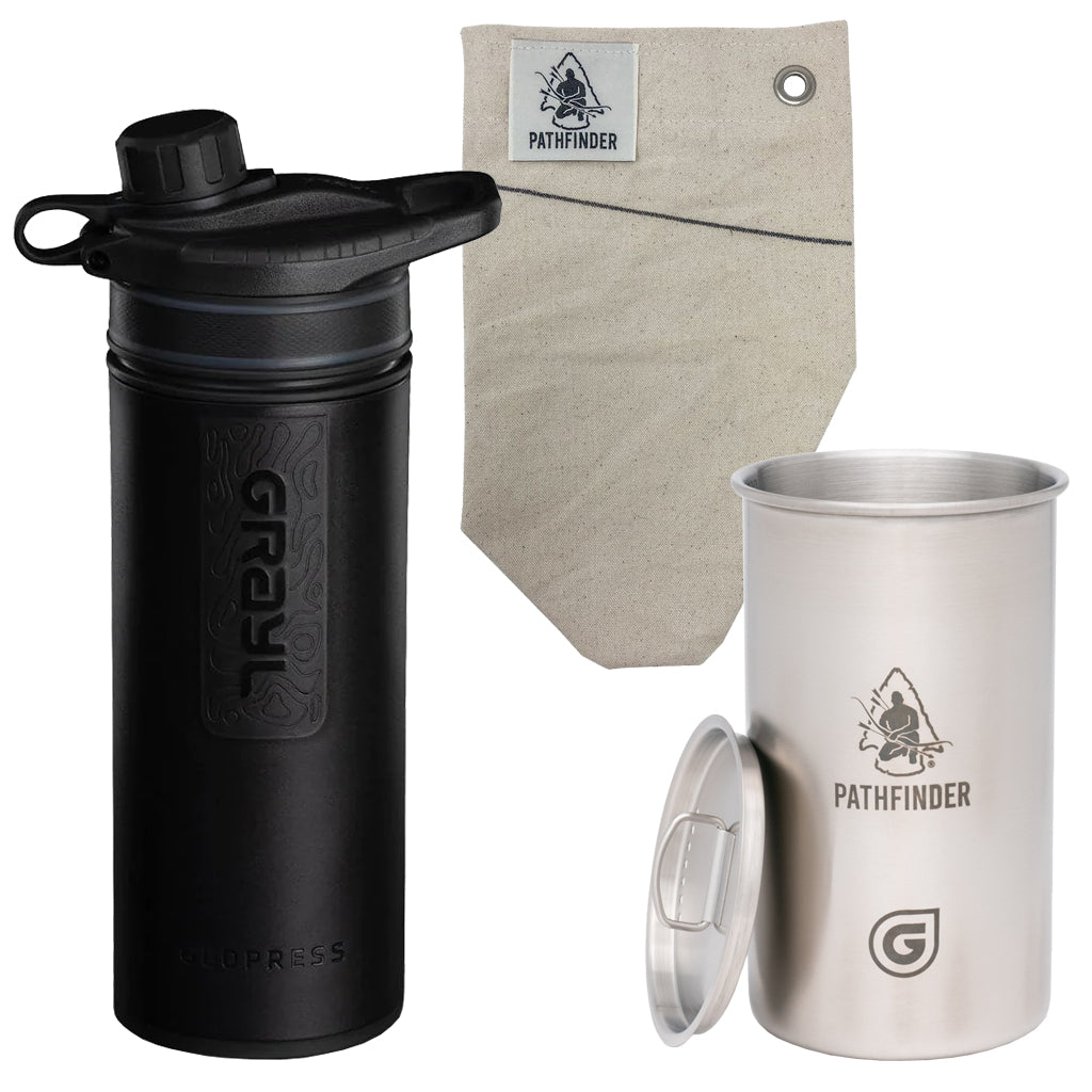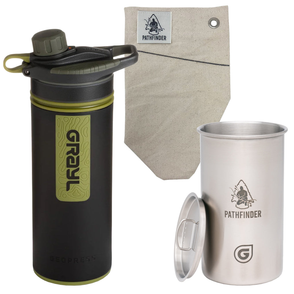 This 4 piece set – Grayl GeoPress (1), Pathfinder+Grayl Nesting Cup (2) with Lid (3) and Pathfinder Millbank Bag (4) make up this exceptional kit that covers all the bases for water filtration and hydration.