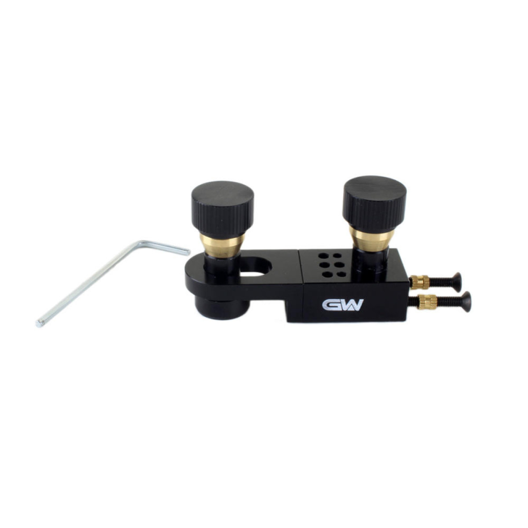 The ultimate tuner pin locator offers a convenient way of drilling tuner holes by taking out the guess work of where to drill the pin holes for tuners that use pins to anchor the key in place. A must have for any luthier or repair shop that frequently install tuners!