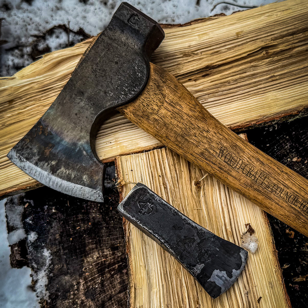 The Hatchet Helper Hand Forged Wedge is meant to pair with a Hatchet for use when the hatchet alone is not enough to split wood for projects or campfires.