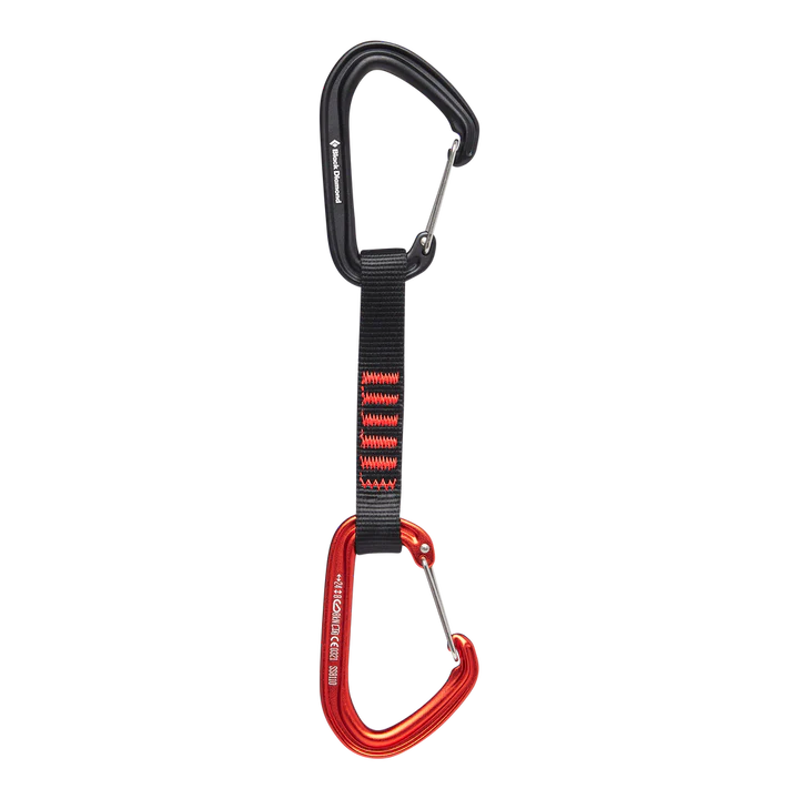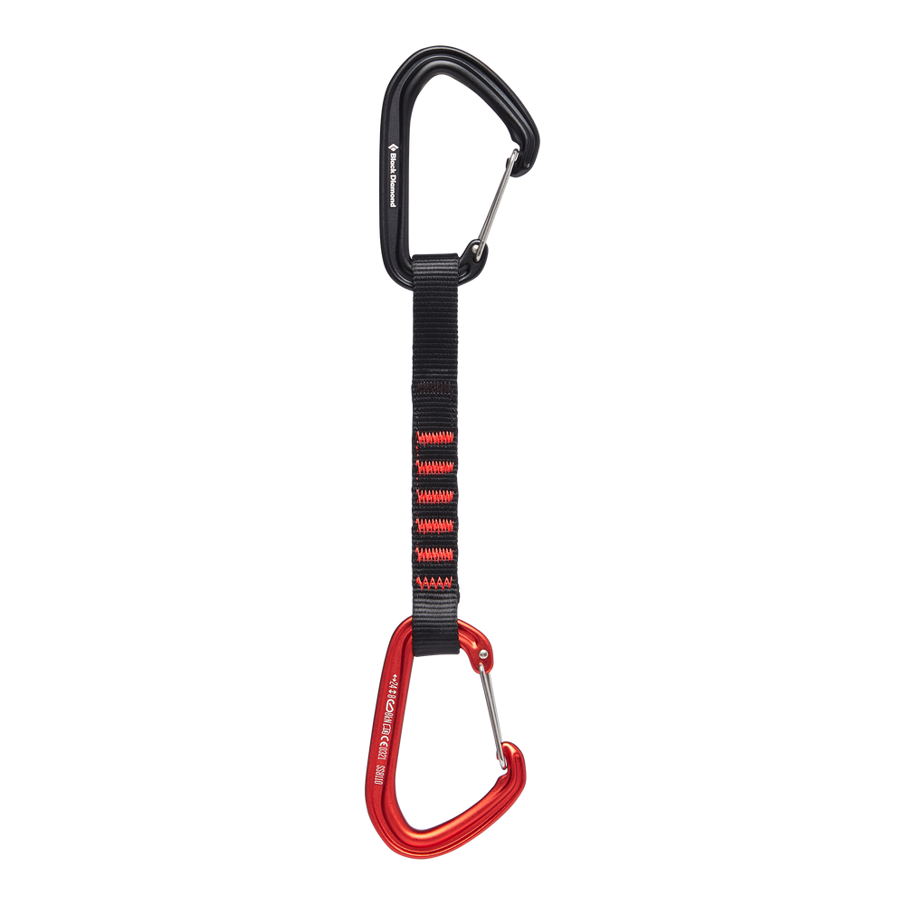 The Black Diamond HotWire Quickdraw gives full wiregate performance at a value. Featuring two updated HotWire wiregate carabiners that utilize a hot-forged lightweight construction and boast a larger rope-bearing surface for greater durability on both the carabiner and your rope, the HotWire Quickdraw comes with a durable 12 or 16 cm length, 18mm Polyester Dogbone which features our Straitjacket insert that keeps the bottom carabiner in the optimal clipping position, and a colored bottom carabiner for a visual target while climbing.Â