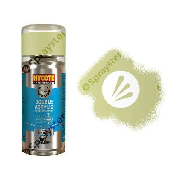 This Hycote Ford Sierra Beige Gloss Spray Paint is a Double Acrylic Concentrated Paint, which means it lasts as long as the big can, but with less packaging.