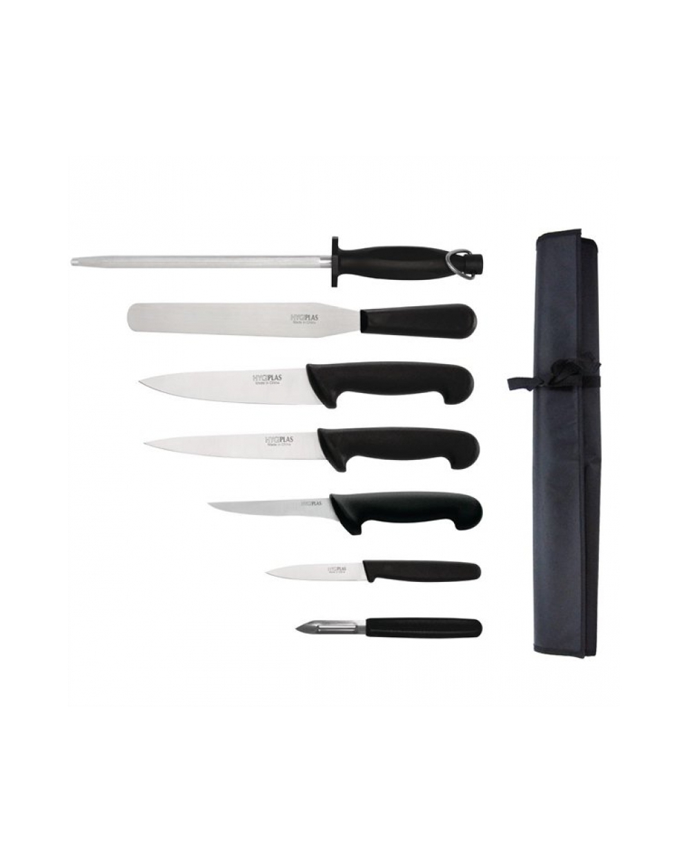 The set features: 1x Hygiplas Boning Knife Stiff Blade Black – 5″, 1x Hygiplas Cooks Knife Black – 8.5″, 1x Hygiplas Fillet Knife Black – 6″, 1x Hygiplas Paring Knife Black – 3″, 1x Hygiplas Plastic Handled Spatula/Palette Knife – 8″, 1x Vogue 13 Compartment Wipe Clean Knife Wallet, 1x Vogue Plastic Peeler Black Moulded Handle, 1x Vogue Steel Plastic Handle – 25.4cm 10″.