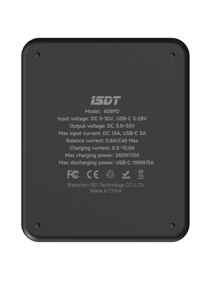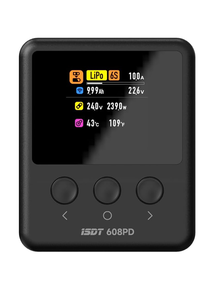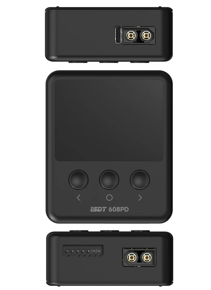 The ISDT 608PD Smart Charger is the new generation of pocket chargers. It is a compact and powerful charger for most common battery types and via its USB-C port it can charge gadgets too. It offers a choice of power inputs, either either via XT60 DC Input (5-30V) or from a USB-C power supply (5-28V). Using the XT60 input, the max charging power is 240W/10A, via the USB-C input the max charging power is 140W 5A. By connecting a LiPo battery to the input on the 608PDB, you can use it as a USB power brick with support for PD2.0/3.0/3.1