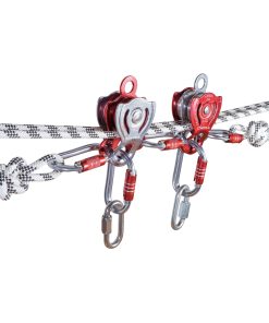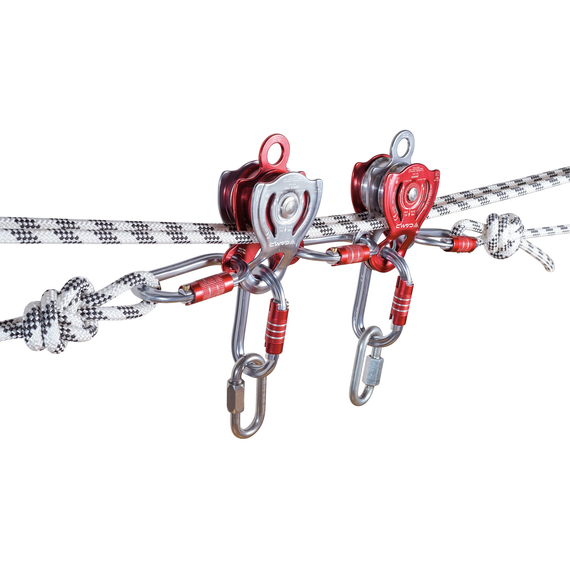The Janus is a high-strength, multifunctional double pulley with large sheaves that has been optimized for complex haul systems and rescue operations. It features a main attachment hole that accommodates three carabiners, two secondary holes on the sides for positioning and a large lower becket hole. Self-lubricated bushings are perfect for light applications at low speed. Prusik knots can be installed on either side (aramid cord suggested).