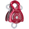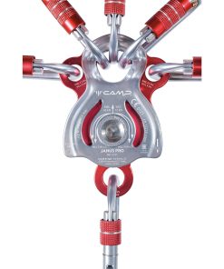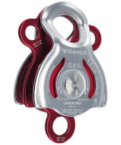 The Janus Pro is a high-strength, multifunctional double pulley with large sheaves for high efficiency haul systems. It uses the same design as the Janus with a main attachment hole that accommodates three carabiners, two secondary holes on the sides for positioning and a large lower becket hole, but features sealed ball bearings for higher efficiency and intensive use at higher speeds. Prusik knots can be installed on either side (aramid cord suggested).
