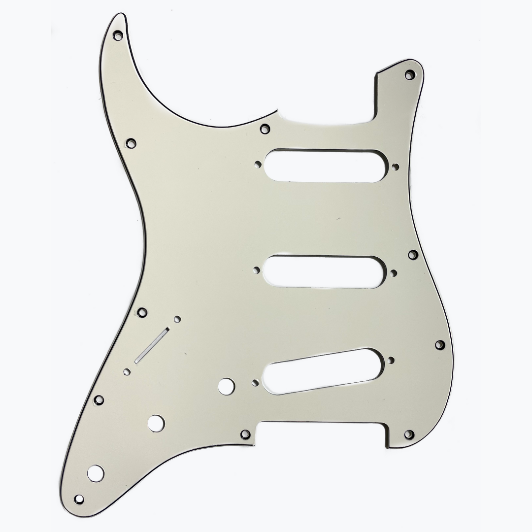 Left handed modern pickguard for Stratocaster. Fits USA spec Fender. Not compatible with Squire. Also available in right hand and other colors