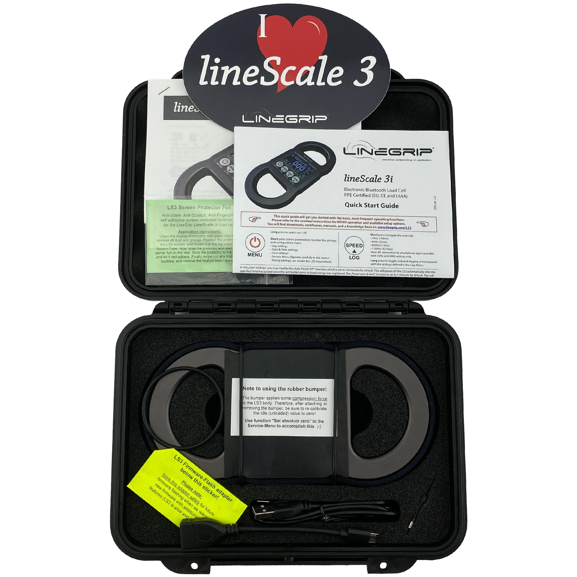 EVERY LINESCALE INCLUDES: LineScale3, hard plastic protective case, charging cable, and firmware flash adapter.