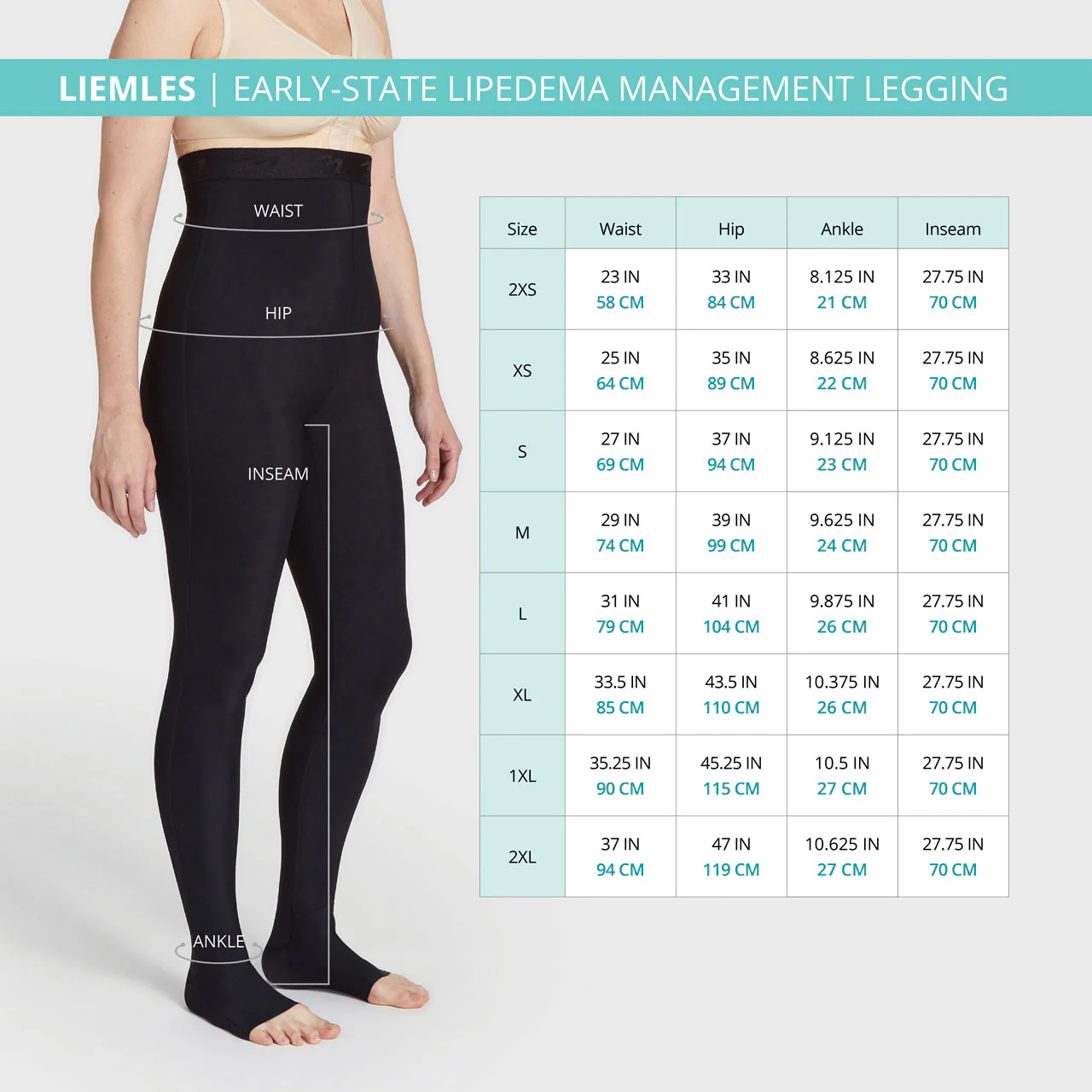 Additional features such as antimicrobial protection and moisture wicking help keep the skin cool and dry, which supports longer wear time. In addition, it can help aid in the appearance of lipoedema by smoothing the skin and contouring the legs.