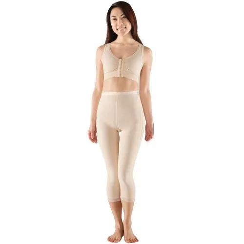 low waisted ladies girdle calf length, 1 inch elastic band, padded zipper closure lboth sides, open crotch. Uses abdominoplasty liposuction of the abdomen, hips thighs size extra small beige