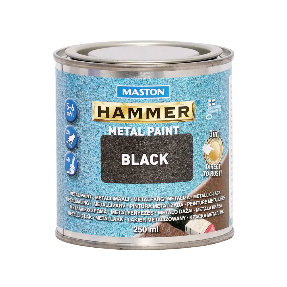 All round Maston Hammer Hammered metal paint, you can handle all metal surfaces, both indoors and outdoors. All in one: rust protection, primer and surface paint. Glossy, tough and hard-wearing hammer-finished, durable surface with only one application. You can paint new and old metal and even directly onto rust. Also, previously painted iron and steel surfaces are easy to paint with Maston HAMMER metallic paint. Suitable also on wooden surfaces.